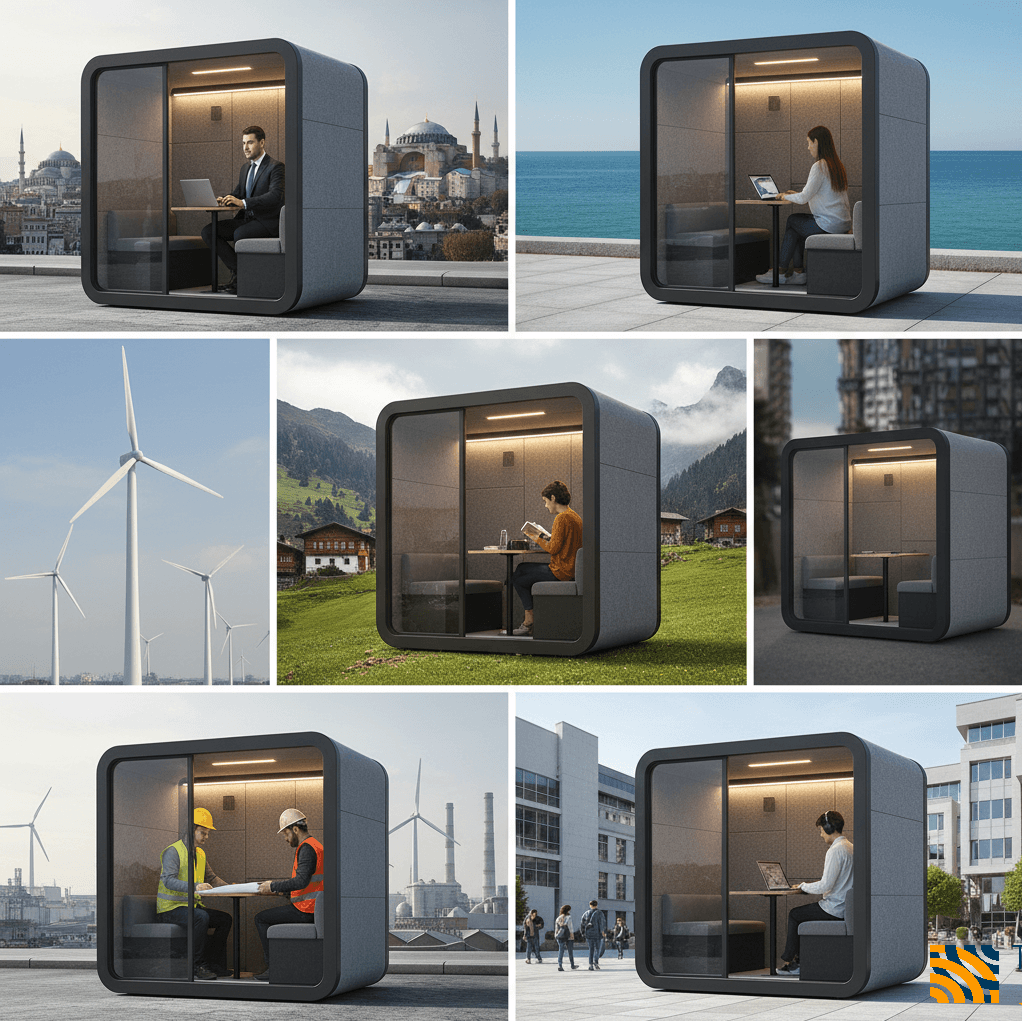Dış mekanlarda sessiz çalışmak isteyen personel için ergonomik ve yalıtımlı mini ofis çözümüdür.